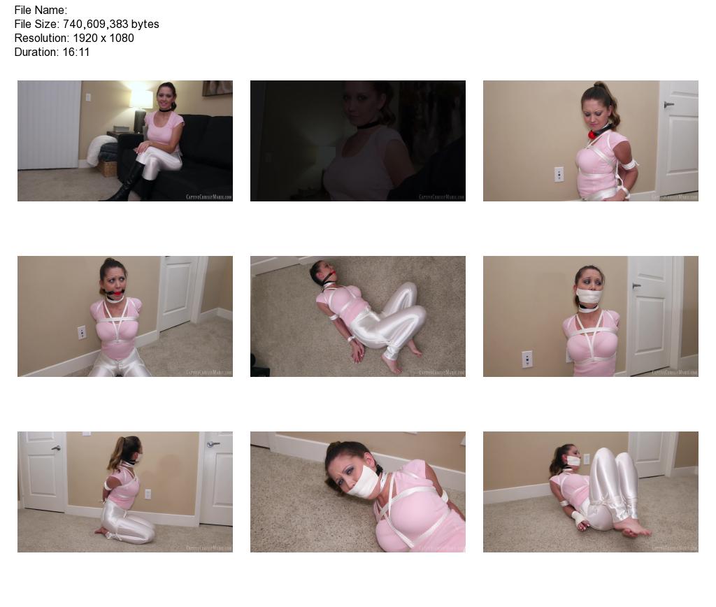 Inside the testing area, Chrissy is restrained with strategically placed white ropes and a large red ball and black belt secured around her neck. The technician lets Chrissy test her restraints for a little while to ensure the maximum restriction of his test subject. Satisfied with the effectiveness of Chrissy’s bindings, the technician returns to administer the next stage of the procedure, the large red rubber ball with a black leather strap hanging around her neck. The technician wedges the ball between Chrissy’s teeth and begins to strap it tightly behind her head. Chrissy attempts to cautiously protest, but her words come out garbled and muddled. Chrissy remains complaint once the technician explains that the purpose of the device is to protect the prison guards from violent prisoners. Chrissy is again left to test out the effectiveness of her ropes and newly added muzzling apparatus.